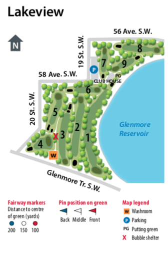 Lakeview offers a well treed 9-hole course along the Glenmore Reservoir. It's beginner friendly with a mix of par 3 and 4 holes, great for practicing your short game. We have a putting green and small clubhouse with a licensed snack bar, and basic golf supplies.